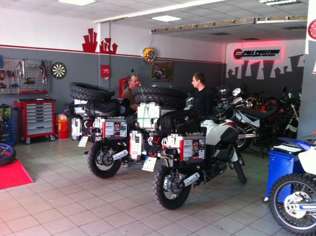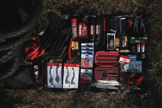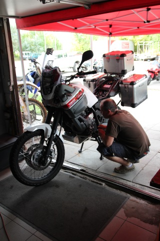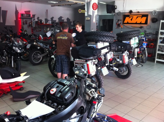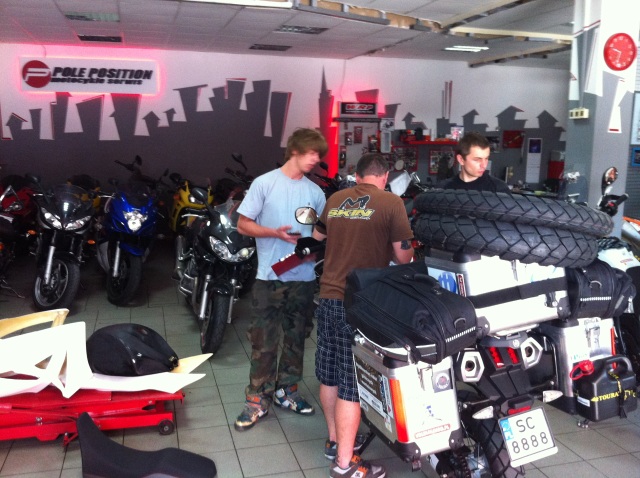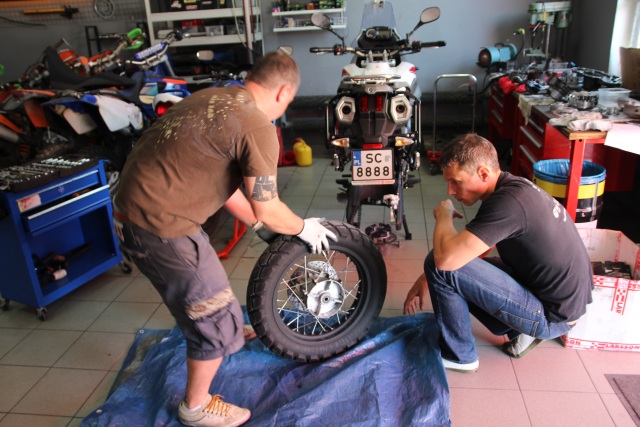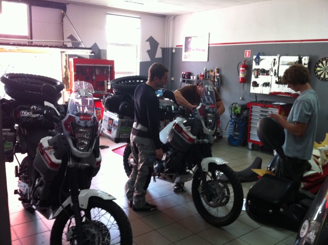 Ostatnie dni przed wyprawą spędzaliśmy w warsztacie Pole Position w Warszawie. Dotychczas zazwyczaj oddawaliśmy motocykle do serwisu bez większego namysłu co, jak i po co będzie zrobione. Na okazje wyprawy warto wiedzieć trochę więcej bo serwis „na kamieniu przy lesie” będzie wymagał co najmniej podstaw. Tak więc rzuciliśmy okiem na układy Tenery po fachowym okiem. Oznaczyliśmy kolorem miejsca gdzie przyłożyć młotek. W warsztacie otrzymaliśmy również pomoc w zorganizowaniu narzędzi , płynów i gratów zamiennych. Cały stuff na focie poniżej. Dzięki Robo!