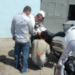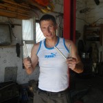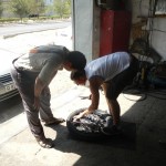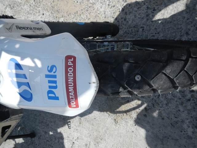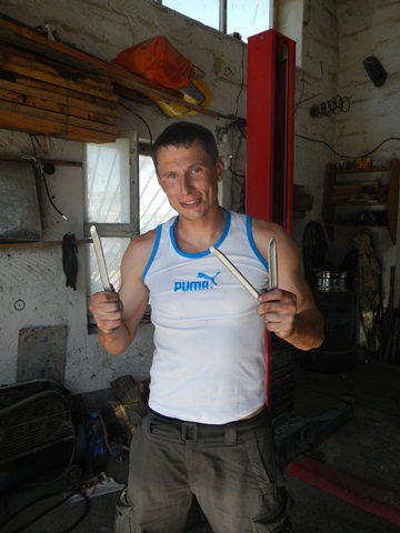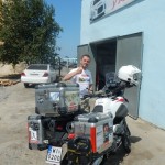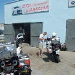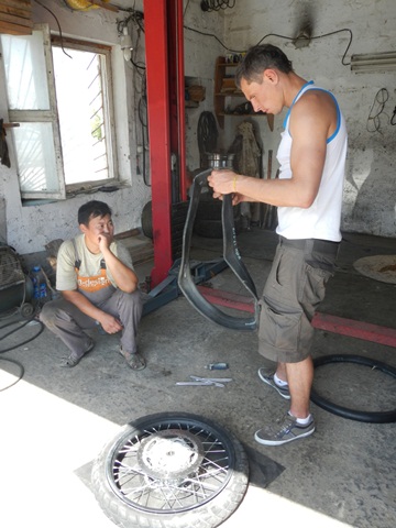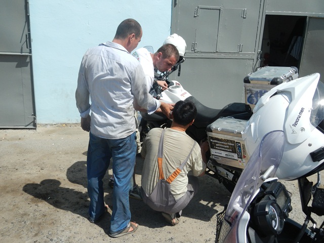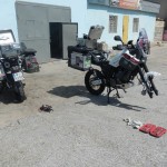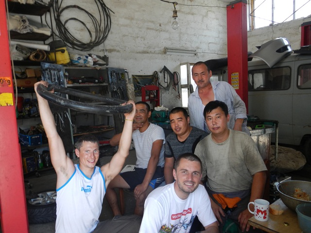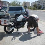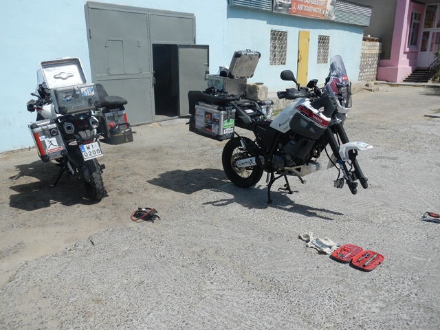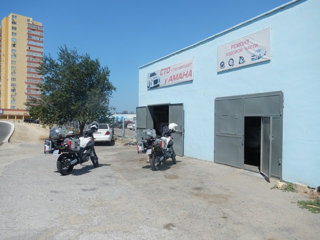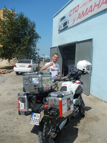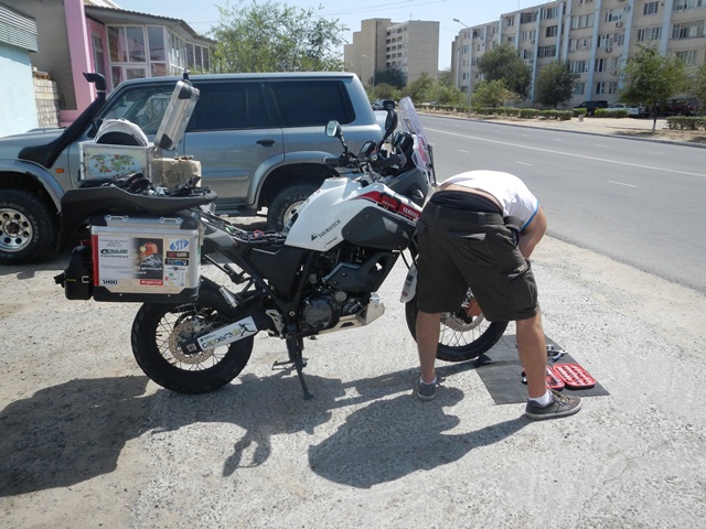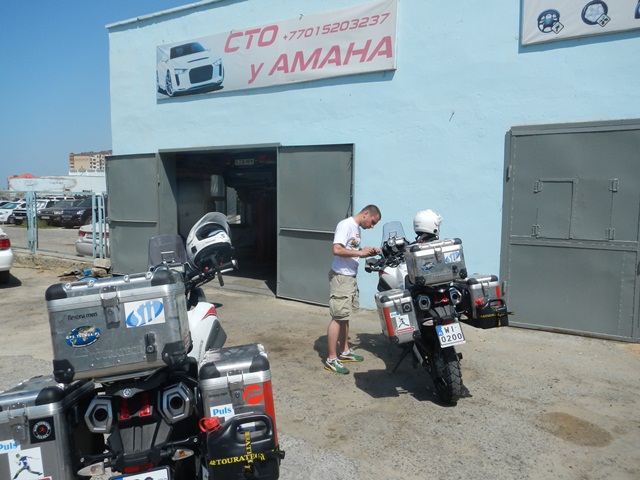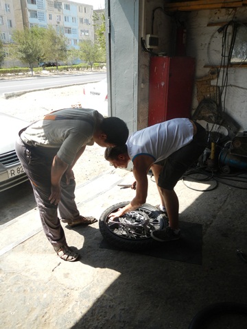 Priorytet postawiliśmy na wizycie u mechanika. To miała być typowa akcja „na szybko” i plaża. Mięliśmy wjechać, zabrać brakujące śrubki od stelaża kufrów i dokręcić te które jeszcze się trzymały. Mechanik zrozumiał o co nam chodziło ale dla pewności zadzwonił po anglojęzycznego przyjaciela Talgata. Talgat spędził jakiś czas w Wielkiej Brytanii więc szybko i jednogłośnie został mianowany naszym tłumaczem do końca pobytu w Aktau. Akcja „na szybko” zakończyła się kiedy z przedniej gumy Maxa zeszło pod warsztatem powietrze. Wróciłem do hotelu po dętkę i łyżki. Takim sposobem zaliczyliśmy pierwszą zmianę na wyprawie.