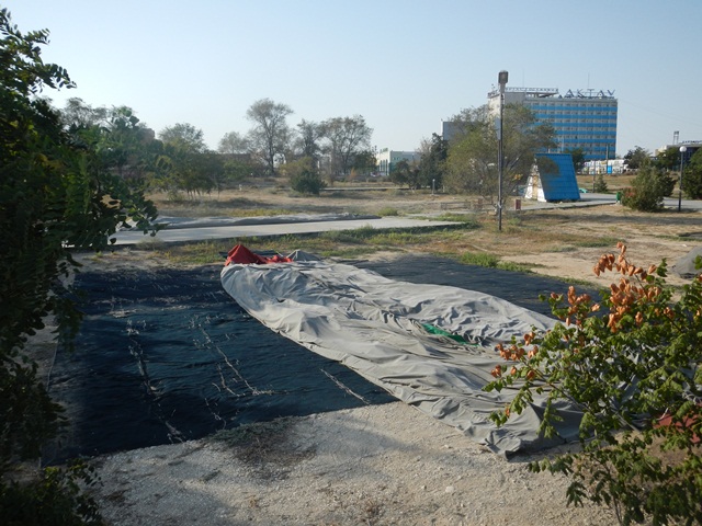 Z uroków kazachskiego Miami bardzo chcieliśmy skorzystać. W zasadzie dlatego się tam wybraliśmy. Dojazd poszedł jak wiadomo, więc trochę mięliśmy niespokojne głowy. Przyjechaliśmy do miejsca sporo poza szlakiem, mocno wyczerpani, motory mocno wytrzęsione.