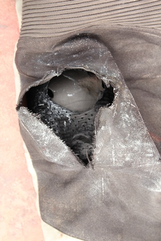 – lewa rękawiczka zupełnie potargana, widoczne otarcie na dłoni i kciuku