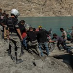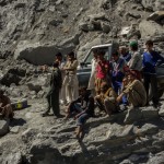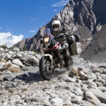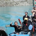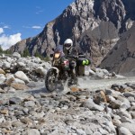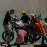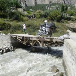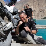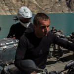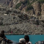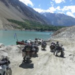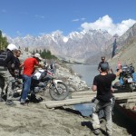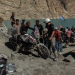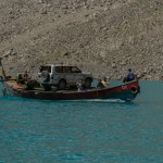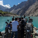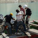 Jako że często zatrzymywaliśmy się tego dnia żeby zrobić kilka fotek, do jeziora dotarliśmy jako ostatni z grupy. KKH w pewnym momencie dotarła do wioski położonej na zboczu całkiem stromej góry i wyraźnie był to koniec trasy. W dole przy jeziorze, w prowizorycznym porcie, zobaczyliśmy zaparkowane motocykle pozostałych członków grupy. Rozmawiali już z ludźmi zajmującymi się transportem łodziami. Nie były to zbyt wielkie i solidnie wyglądające łodzie, co budziło w nas lekki niepokój. Po chwili okazało się, że aby się przeprawić musimy dotrzeć na drugą stronę wzgórza, na którym położona jest wioska, gdzie czeka na nas inna łódź. Przez wioskę przeprowadził nas miejscowy realizator filmowy, który podróżował na tylnym fotelu motocykla Marco. Przejazd przez wioskę to kolejna atrakcja, której zupełnie się nie spodziewaliśmy. Wąska i kręta droga między małymi budynkami i polami uprawnymi była świetna frajdą. Frajdę mieliśmy my oraz wszystkie miejscowe dzieciaki, które słysząc ryk 10 motocykli, wybiegały na drogę machając nam w geście pozdrowienia. Drogą prowadziła prawie na szczyt wioski, skąd mogliśmy podziwiać urokliwie położone jezioro Attabad Lake. Kiedy dotarliśmy na nabrzeże, okazało się że nasza łódź wcale nie była większa od widzianych wcześniej. Ułożone na niej były drewniane pale, każdy wielkości może dwóch podkładów kolejowych. Zaparkowaliśmy motocykle, przywitaliśmy się z przewoźnikami i pomyśleliśmy: „No dobra, jak oni zamierzają wsadzić dziesięć motocykli na tą łódeczkę, a potem przepłynąć jezioro tak żeby nie była potrzebna pomoc nurków?”.
