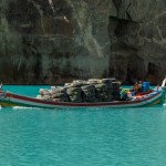 Kiedy już tak spokojnie płynęliśmy do brzegu, nie wiedzieliśmy jeszcze ile emocji wzbudzi rozładunek. Nabrzeża było wysokie i strome. Wszędzie stali ludzie z zaciekawieniem obserwujący nadpływający niecodzienny transport. Na pierwszy rzut oka wydawało się, że nawet nie ma gdzie się przytulić do lądu, ponieważ były tam już zacumowane dwie inne łodzie. Nasz sprytny kapitan jakoś sobie poradził. Oczywiście przy manewrowaniu zawadził o skały belkami, na których stały motocykle, w wyniku czego motocykl Analeen prawie spadł na dolny pokład. Musieliśmy na zmianę trzymać wciśnięty przedni hamulec, co utrzymywało przednie koło na belce. Ponownie uzbroiliśmy się w stalowe nerwy i pozwoliliśmy pracować ekipie. Na nabrzeżu było tak mało miejsca, że motocykle trzeba było szarpać i ustawiać w kierunku drogi, tak aby tylko na nie wsiąść i nie patrząc na boki na gazie wjechać pod strome zbocze. Si i Pilar, które podróżowały jako pasażerki, dystans pokonały na piechotę. Nie było innego wyjścia.
