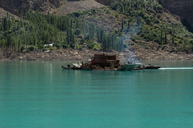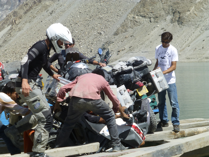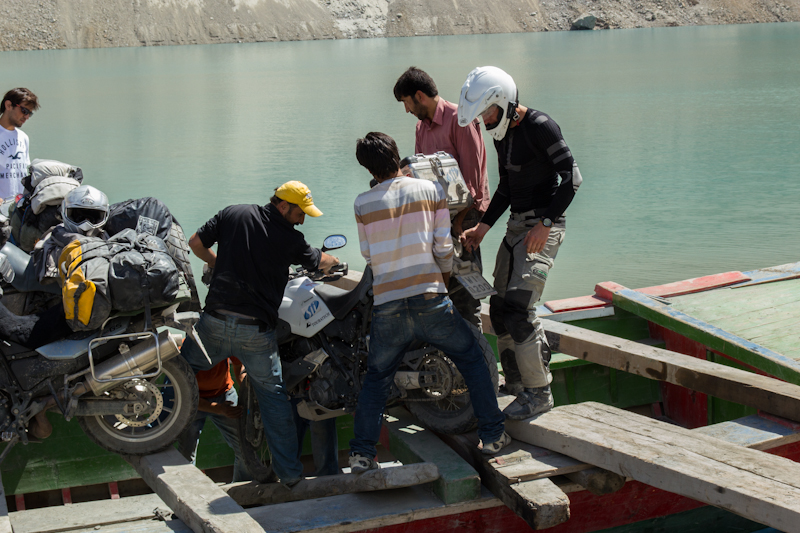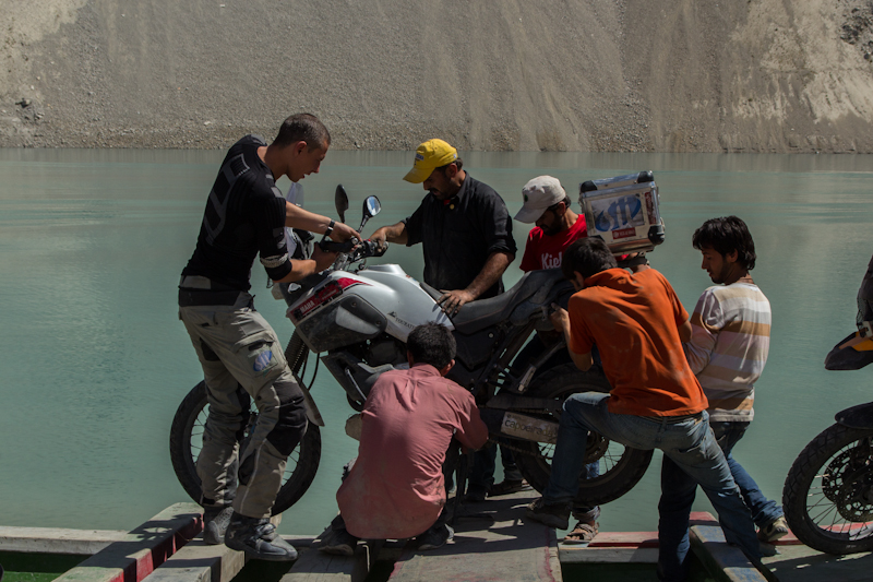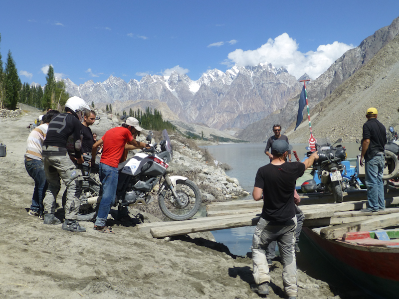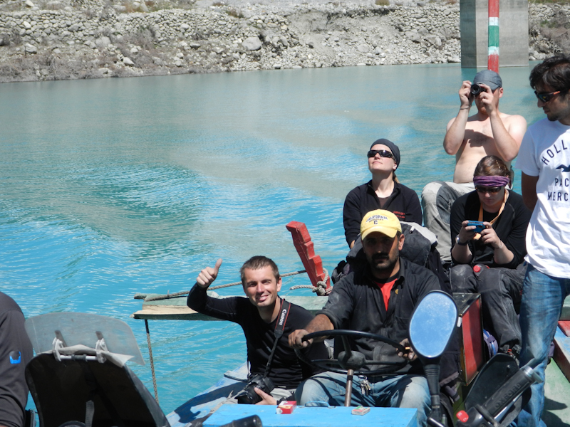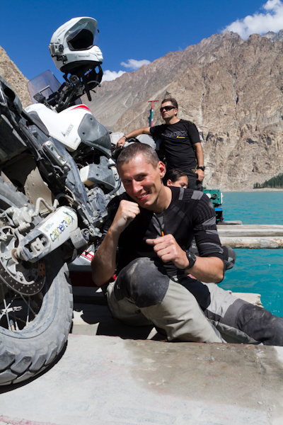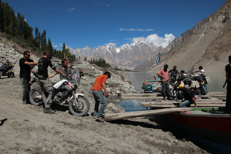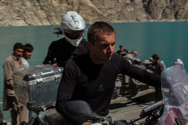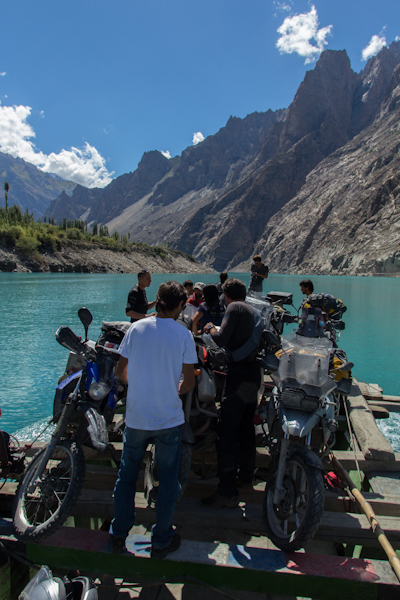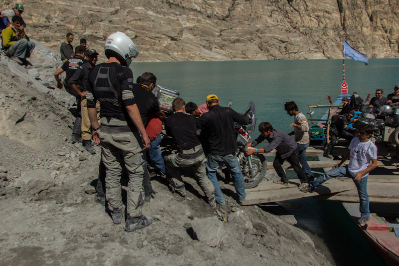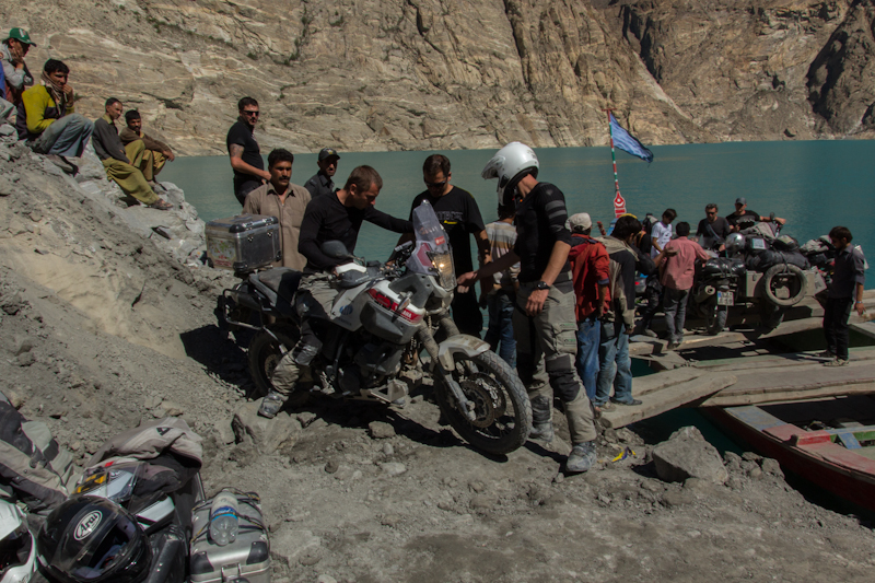 Jako że często zatrzymywaliśmy się tego dnia żeby zrobić kilka fotek, do jeziora dotarliśmy jako ostatni z grupy. KKH w pewnym momencie dotarła do wioski położonej na zboczu całkiem stromej góry i wyraźnie był to koniec trasy. W dole przy jeziorze, w prowizorycznym porcie, zobaczyliśmy zaparkowane motocykle pozostałych członków grupy. Rozmawiali już z ludźmi zajmującymi się transportem łodziami. Nie były to zbyt wielkie i solidnie wyglądające łodzie, co budziło w nas lekki niepokój. Po chwili okazało się, że aby się przeprawić musimy dotrzeć na drugą stronę wzgórza, na którym położona jest wioska, gdzie czeka na nas inna łódź. Przez wioskę przeprowadził nas miejscowy realizator filmowy, który podróżował na tylnym fotelu motocykla Marco. Przejazd przez wioskę to kolejna atrakcja, której zupełnie się nie spodziewaliśmy. Wąska i kręta droga między małymi budynkami i polami uprawnymi była świetna frajdą. Frajdę mieliśmy my oraz wszystkie miejscowe dzieciaki, które słysząc ryk 10 motocykli, wybiegały na drogę machając nam w geście pozdrowienia. Drogą prowadziła prawie na szczyt wioski, skąd mogliśmy podziwiać urokliwie położone jezioro Attabad Lake. Kiedy dotarliśmy na nabrzeże, okazało się że nasza łódź wcale nie była większa od widzianych wcześniej. Ułożone na niej były drewniane pale, każdy wielkości może dwóch podkładów kolejowych. Zaparkowaliśmy motocykle, przywitaliśmy się z przewoźnikami i pomyśleliśmy: „No dobra, jak oni zamierzają wsadzić dziesięć motocykli na tą łódeczkę, a potem przepłynąć jezioro tak żeby nie była potrzebna pomoc nurków?”.