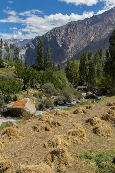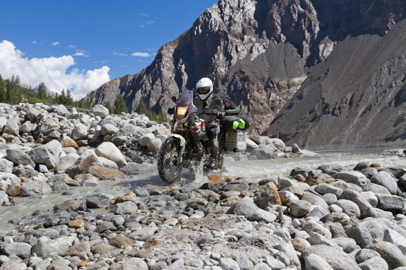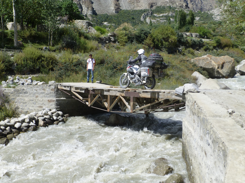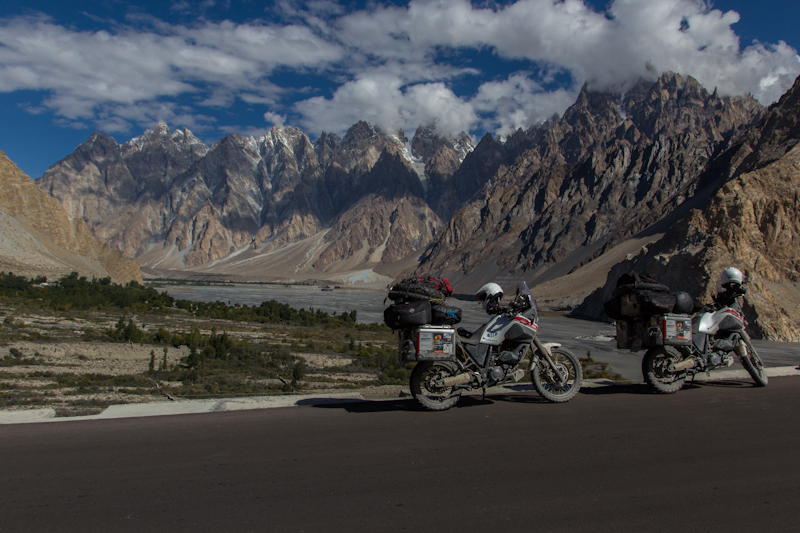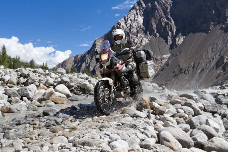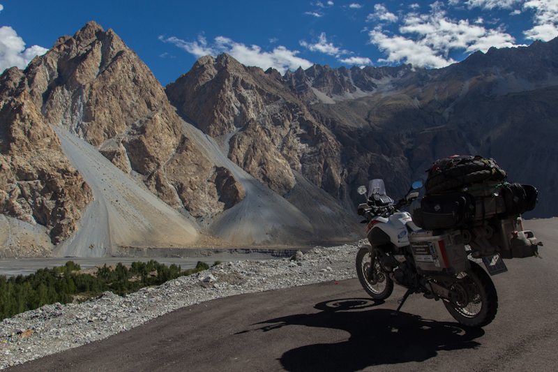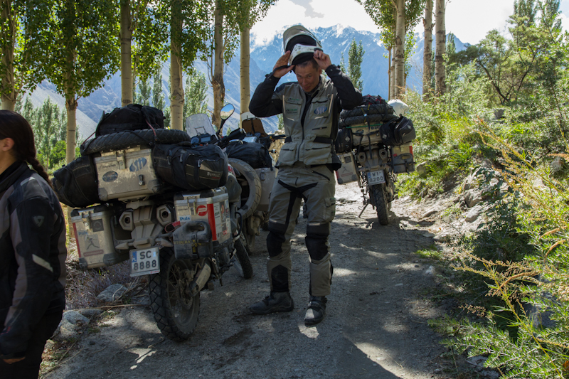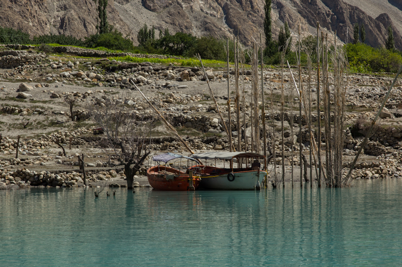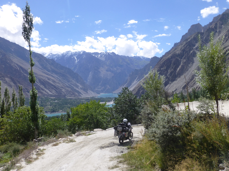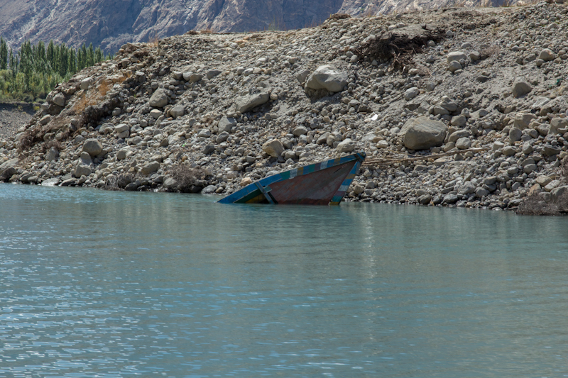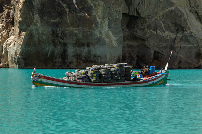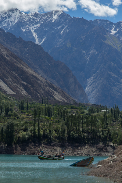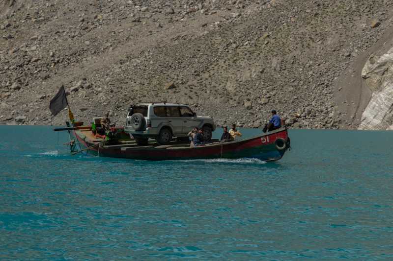 Jako że często zatrzymywaliśmy się tego dnia żeby zrobić kilka fotek, do jeziora dotarliśmy jako ostatni z grupy. KKH w pewnym momencie dotarła do wioski położonej na zboczu całkiem stromej góry i wyraźnie był to koniec trasy. W dole przy jeziorze, w prowizorycznym porcie, zobaczyliśmy zaparkowane motocykle pozostałych członków grupy. Rozmawiali już z ludźmi zajmującymi się transportem łodziami. Nie były to zbyt wielkie i solidnie wyglądające łodzie, co budziło w nas lekki niepokój. Po chwili okazało się, że aby się przeprawić musimy dotrzeć na drugą stronę wzgórza, na którym położona jest wioska, gdzie czeka na nas inna łódź. Przez wioskę przeprowadził nas miejscowy realizator filmowy, który podróżował na tylnym fotelu motocykla Marco. Przejazd przez wioskę to kolejna atrakcja, której zupełnie się nie spodziewaliśmy. Wąska i kręta droga między małymi budynkami i polami uprawnymi była świetna frajdą. Frajdę mieliśmy my oraz wszystkie miejscowe dzieciaki, które słysząc ryk 10 motocykli, wybiegały na drogę machając nam w geście pozdrowienia. Drogą prowadziła prawie na szczyt wioski, skąd mogliśmy podziwiać urokliwie położone jezioro Attabad Lake. Kiedy dotarliśmy na nabrzeże, okazało się że nasza łódź wcale nie była większa od widzianych wcześniej. Ułożone na niej były drewniane pale, każdy wielkości może dwóch podkładów kolejowych. Zaparkowaliśmy motocykle, przywitaliśmy się z przewoźnikami i pomyśleliśmy: „No dobra, jak oni zamierzają wsadzić dziesięć motocykli na tą łódeczkę, a potem przepłynąć jezioro tak żeby nie była potrzebna pomoc nurków?”.