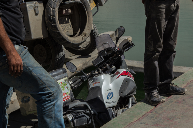Grupka przewoźników przystąpiła do załadunku. Wpychali na łódź na zmianę motocykle lżejsze i cięższe. Sporo emocji wzbudził załadunek „słonia” BMW 1200 GS Adventure. Łódź nieustannie kiwała się na lewo i prawo i kilkakrotnie ktoś wbiegał po palach aby łapać swój motocykl, który wydawał się już bliski wodowania. Zimny pot oblewał plecy każdego z nas ale wiedzieliśmy że po prostu musimy zaufać tym ludziom i oddać nasze motocykle w ich ręce. Atmosferę rozładował Uli swoim kultowym już „Don’t touch the bikes!”. Ostatecznie udało się. Motocykle zostały załadowane. Cała przeprawa trwała może nieco ponad godzinę. Widoki przepiękne. Mijały nas łodzie, na których miejscowi przeprawiali nawet samochody terenowe i ciężarowe. Plotka głosi, że około 40 samochodów utopiono.