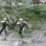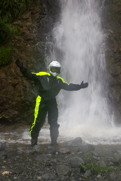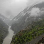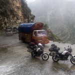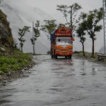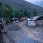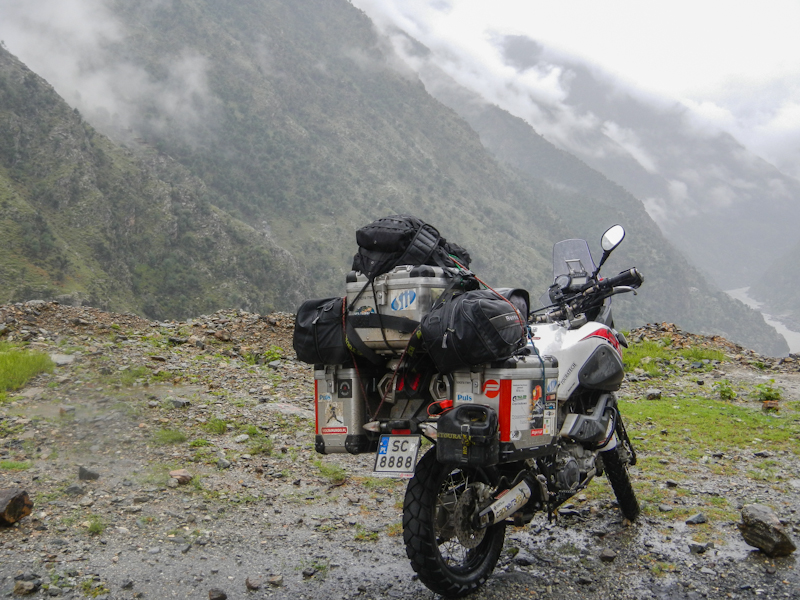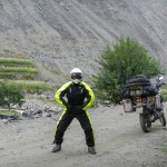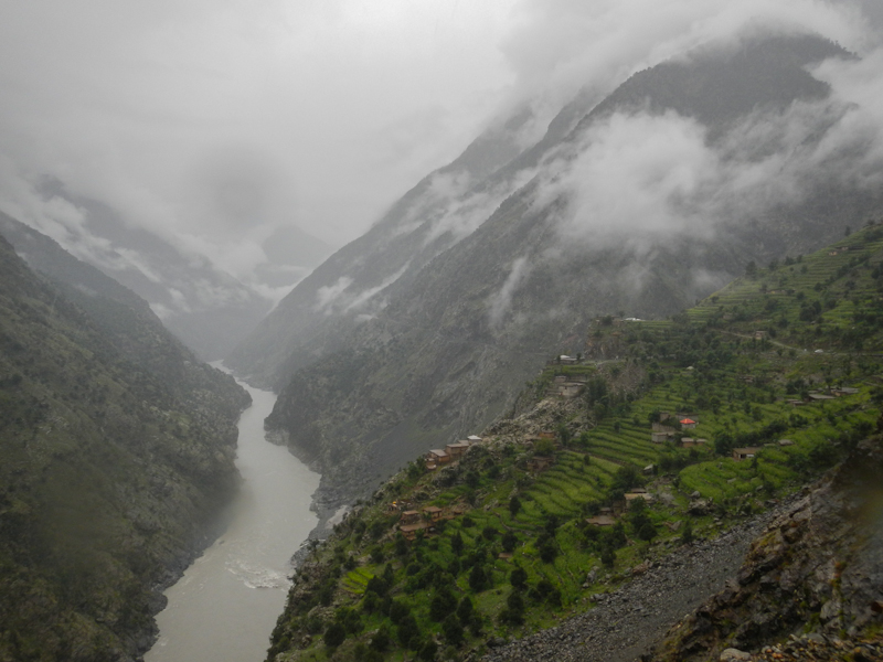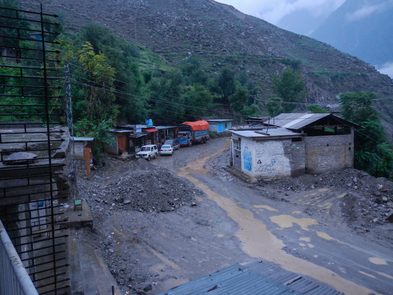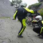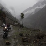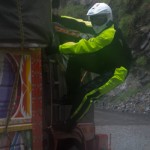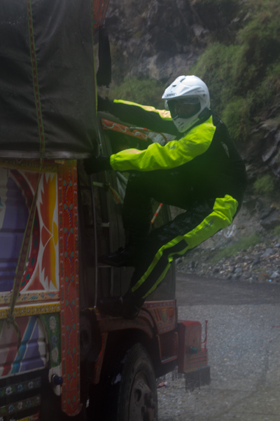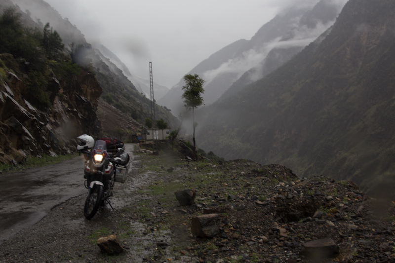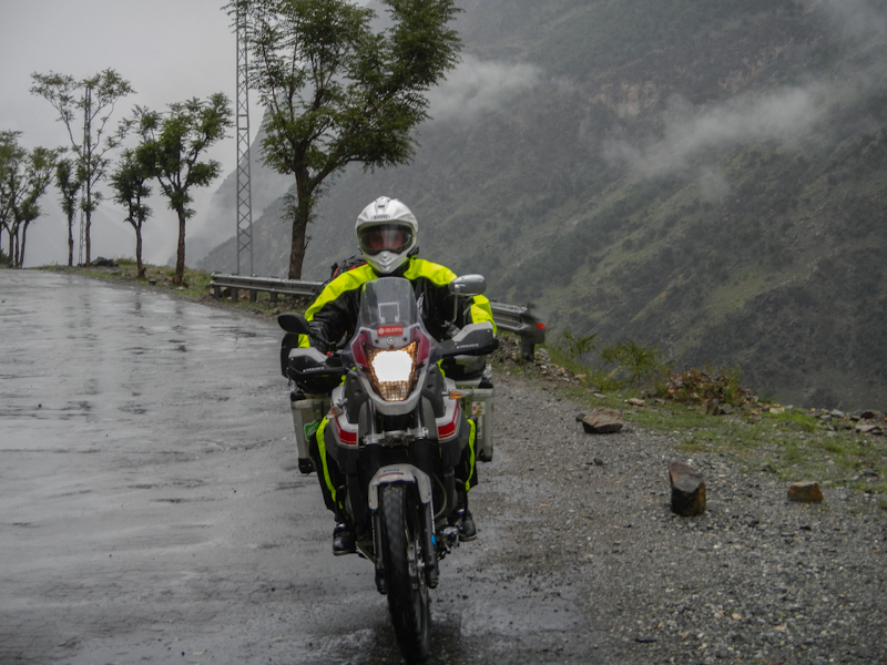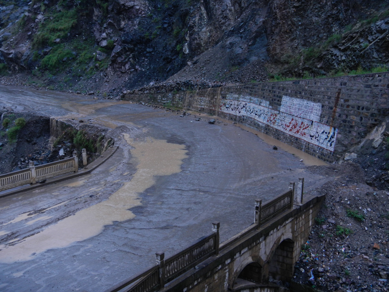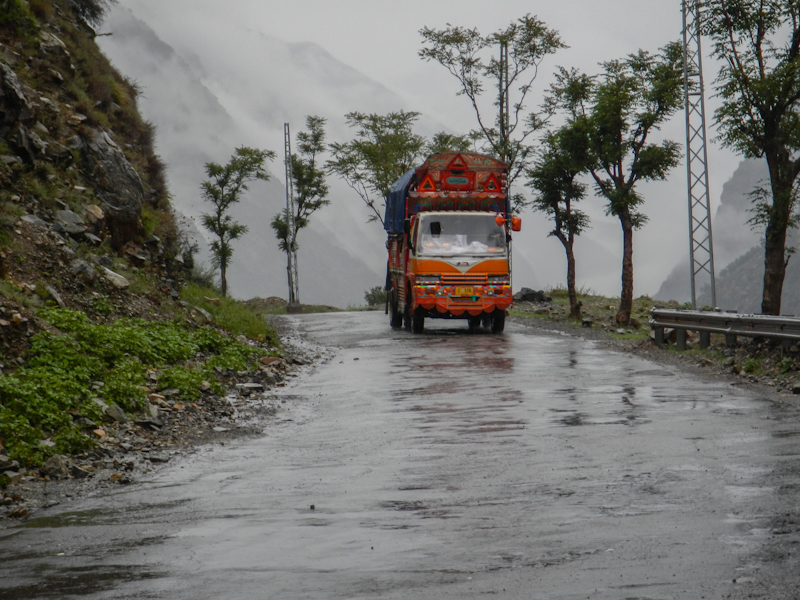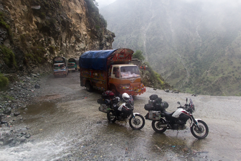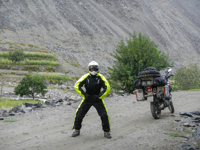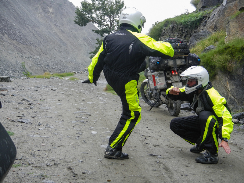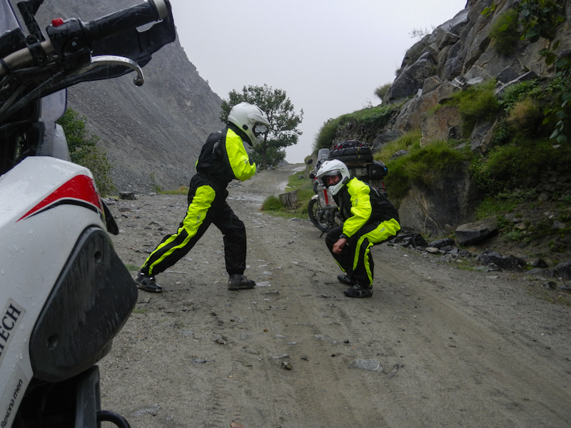 Do Islamabadu mięliśmy około 480km wzdłuż Karakorum Highway. Planowaliśmy pojechać skrótem przez góry, który podobno był wymagający ale okazał się możliwy do pokonania przez samotnie jadącego kilka dni wcześniej Włocha – Marko. Tego ranka wstaliśmy oraz wyruszyliśmy na trasę oczywiście jako ostatni z całej grupy ok 11:00. Kiedy dzień wcześniej dyskutowaliśmy o tym co odeślemy do domu w Islamabadzie, celem pozbycia się zbędnych kilogramów, jednym z kandydatów stał się przeciwdeszczowy kombinezon Modeki, który do tej do pory nigdy się nie przydał. Aż do tamtego dnia. Kiedy już zjechaliśmy z Karakorumm Highway w kierunku skrótu, zaczął padać gęsty deszcz. Dodatkowo okazało się że pomyliliśmy drogę, po raz drugi tego dnia na dystansie może 5km, a w zasadzie nie zauważyliśmy mostu przez który należało przejechać. Był dosyć dobrze skamuflowany. Droga którą jechaliśmy rzeczywiście nie była pierwszej jakości ale byliśmy już do tego tak przyzwyczajeni że w ogóle nie podejrzewaliśmy że mogliśmy zboczyć z kursu. Staruszek w małej wiosce powiedział nam o moście kilka kilometrów wcześniej. Deszcz przybierał na sile więc wskoczyliśmy w kombinezony. Przeprowadziliśmy profesjonalny test i okazało się że da się w nich nawet grać Capoeira. W tym momencie, po drugiej stronie rzeki, na właściwej drodze ujrzeliśmy wracających Jose i Pilar z Hiszpanii oraz Si i Jeffa z USA. Zostali zawróceni z pierwszego punktu kontrolnego przez policję. Nie pchaliśmy się więc dalej i wróciliśmy na KKH. Zastanawialiśmy się co z Johnem z UK oraz Marco z Finlandii którzy wyruszyli wczesnym rankiem. Obawialiśmy się że mogą trafić na śnieg.